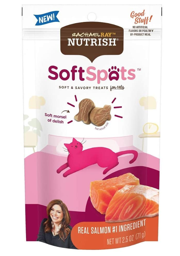 If your furry child thinks fish is delish, she’ll delight in Rachael Ray Nutrish Soft Spots Salmon Flavored Cat Treats! Using a mouth-watering recipe inspired by Rachael Ray’s kitchen, these tasty goodies have earned five-star ratings from the most discerning kitty food critics. Your feline friend deserves nothing but the best, and these Soft Spots deliver — with real salmon as the number one ingredient and containing no poultry by-products, meals or artificial flavors. Their moist, chewy consistency and savory taste makes them delicious as well as easy on cats’ teeth.
